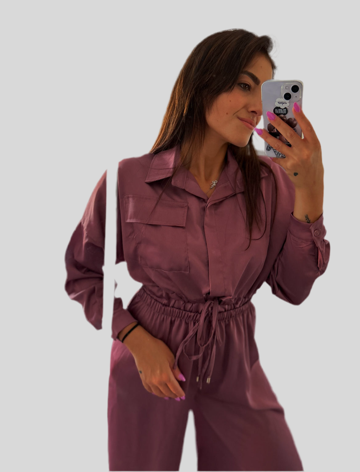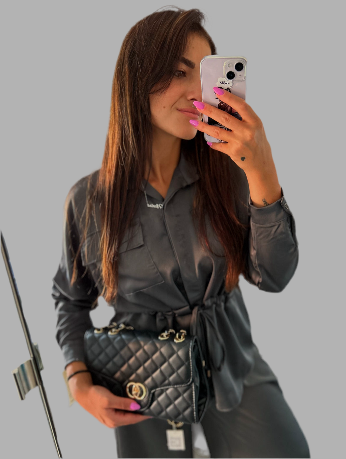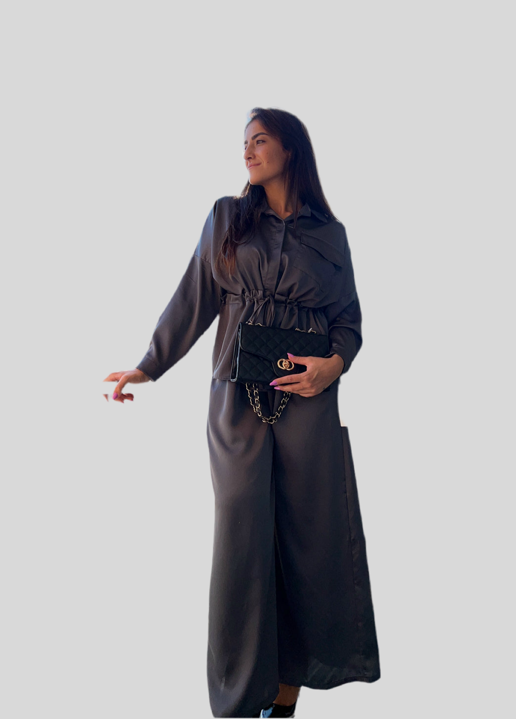 Completo in raso in manica lunga e pantalone a palazzo , grigio scuro o rosa