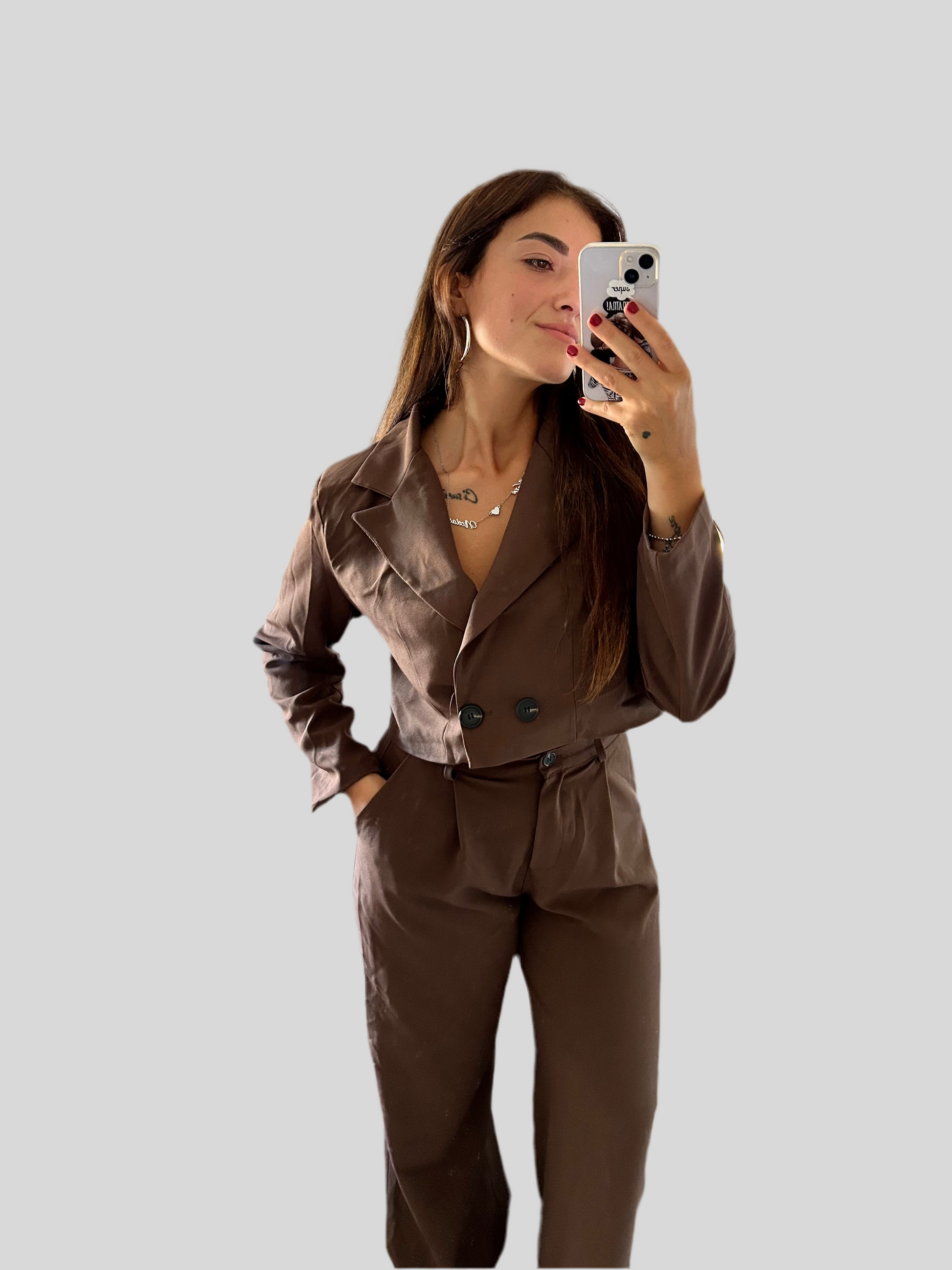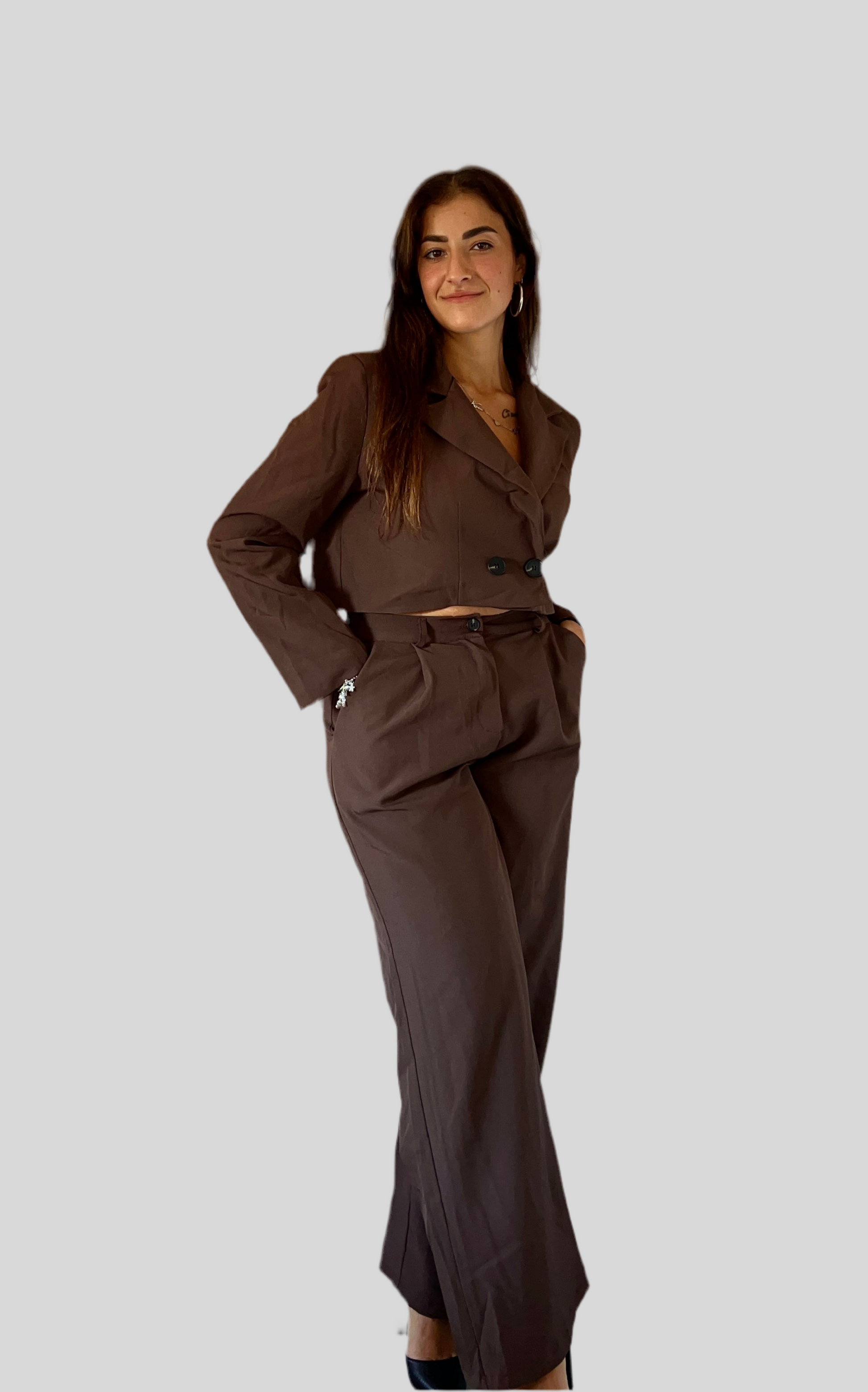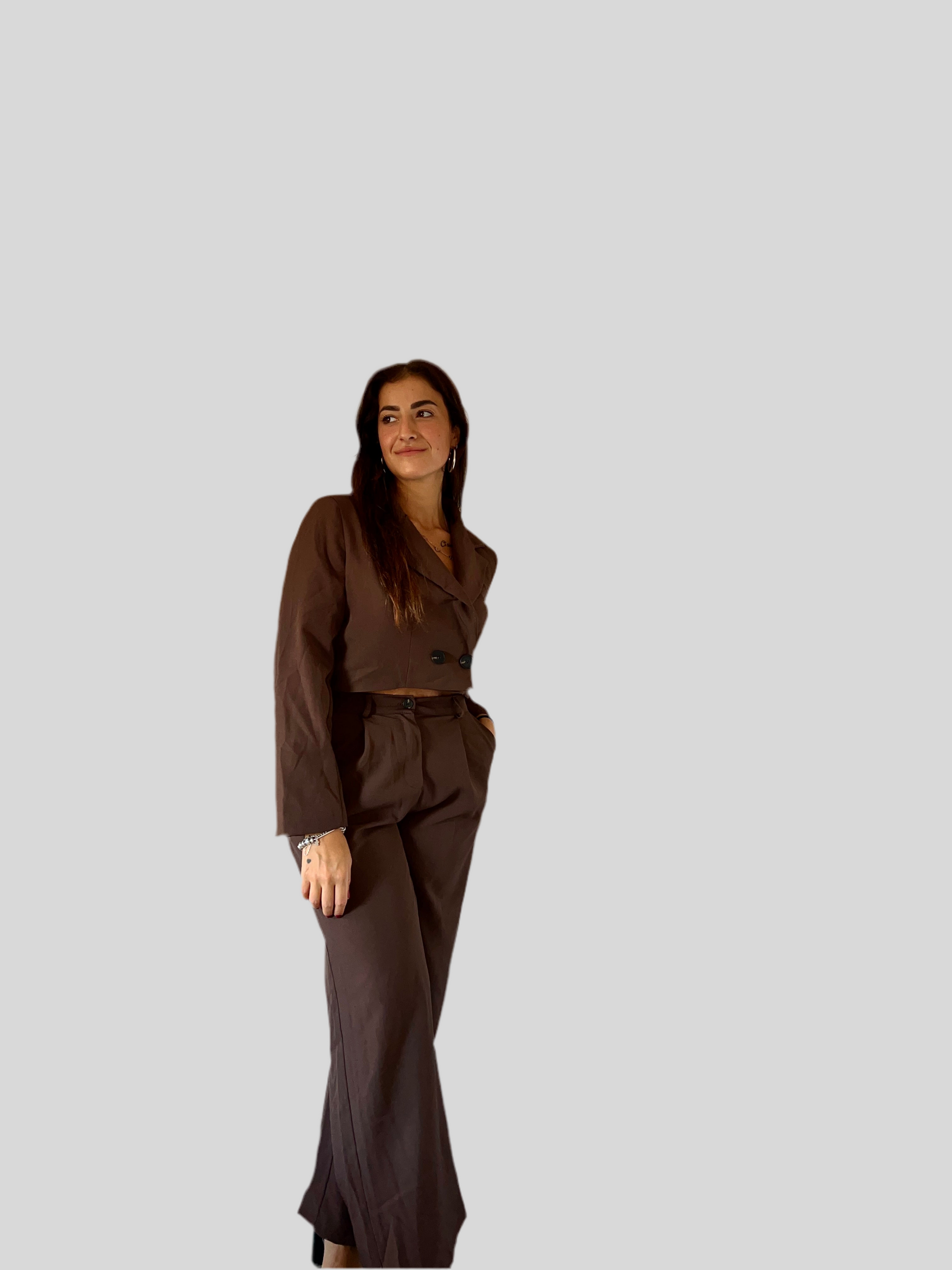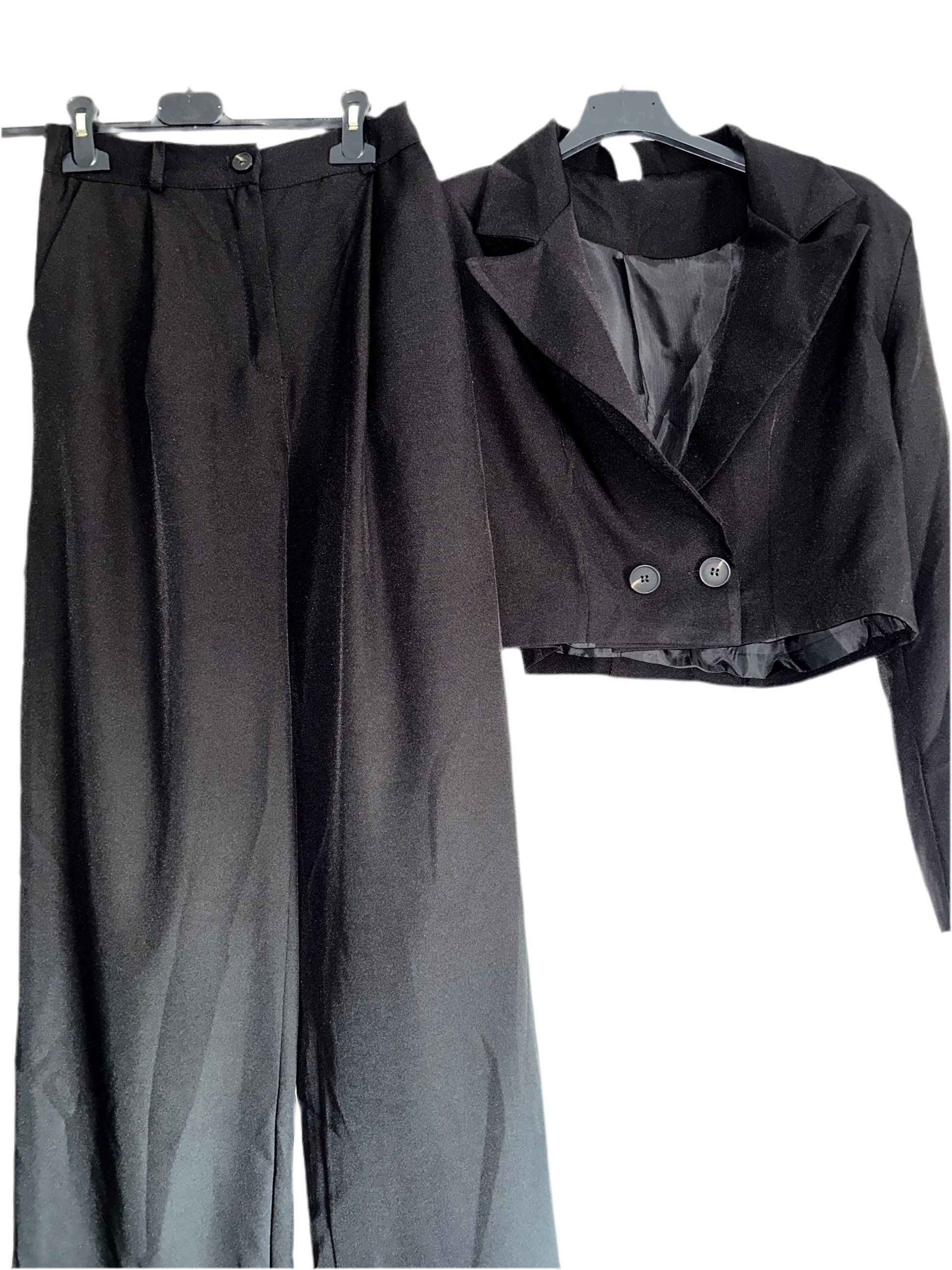 Completo giacca crop e pantalone a palazzo elastico a vita alta