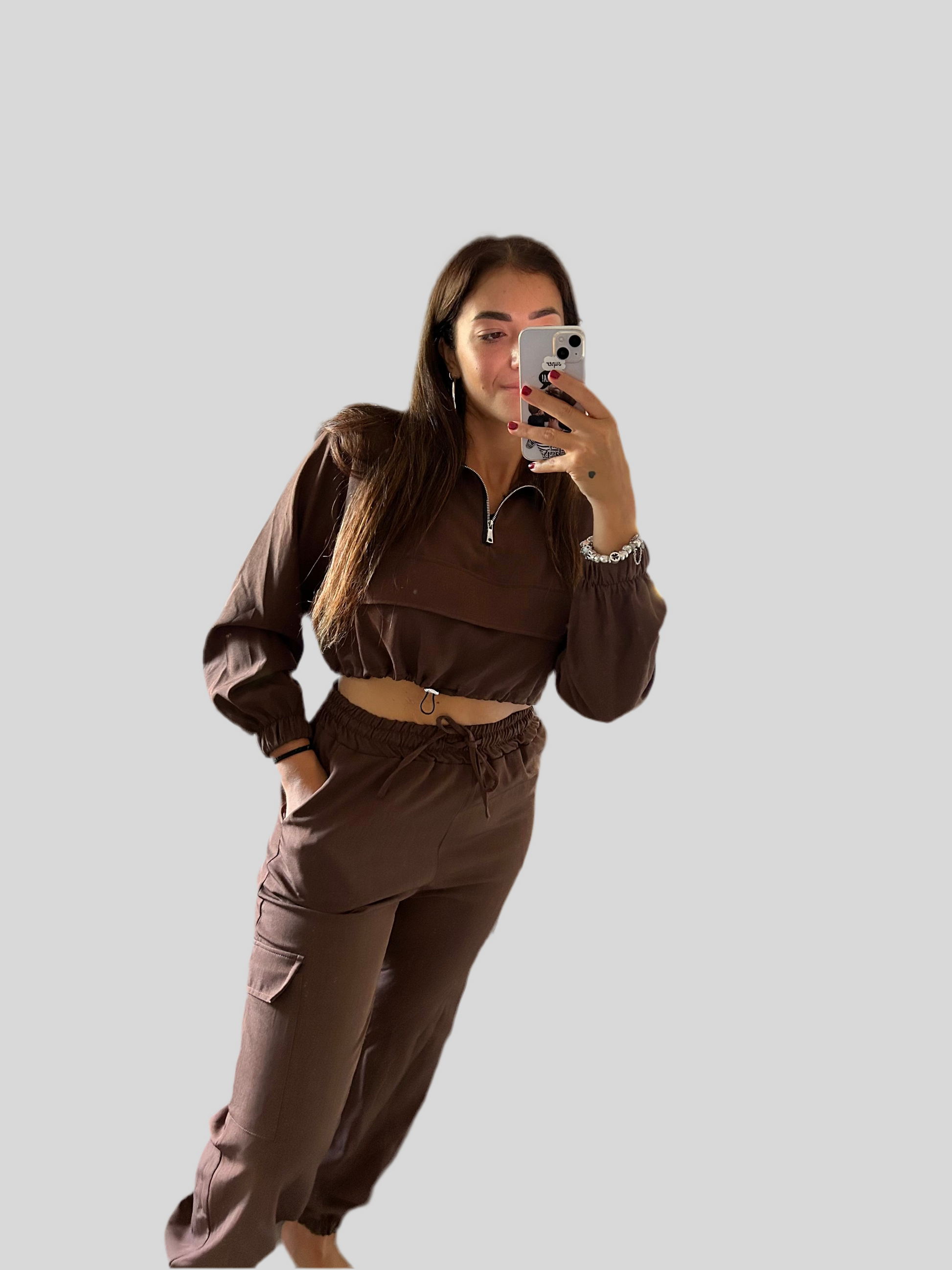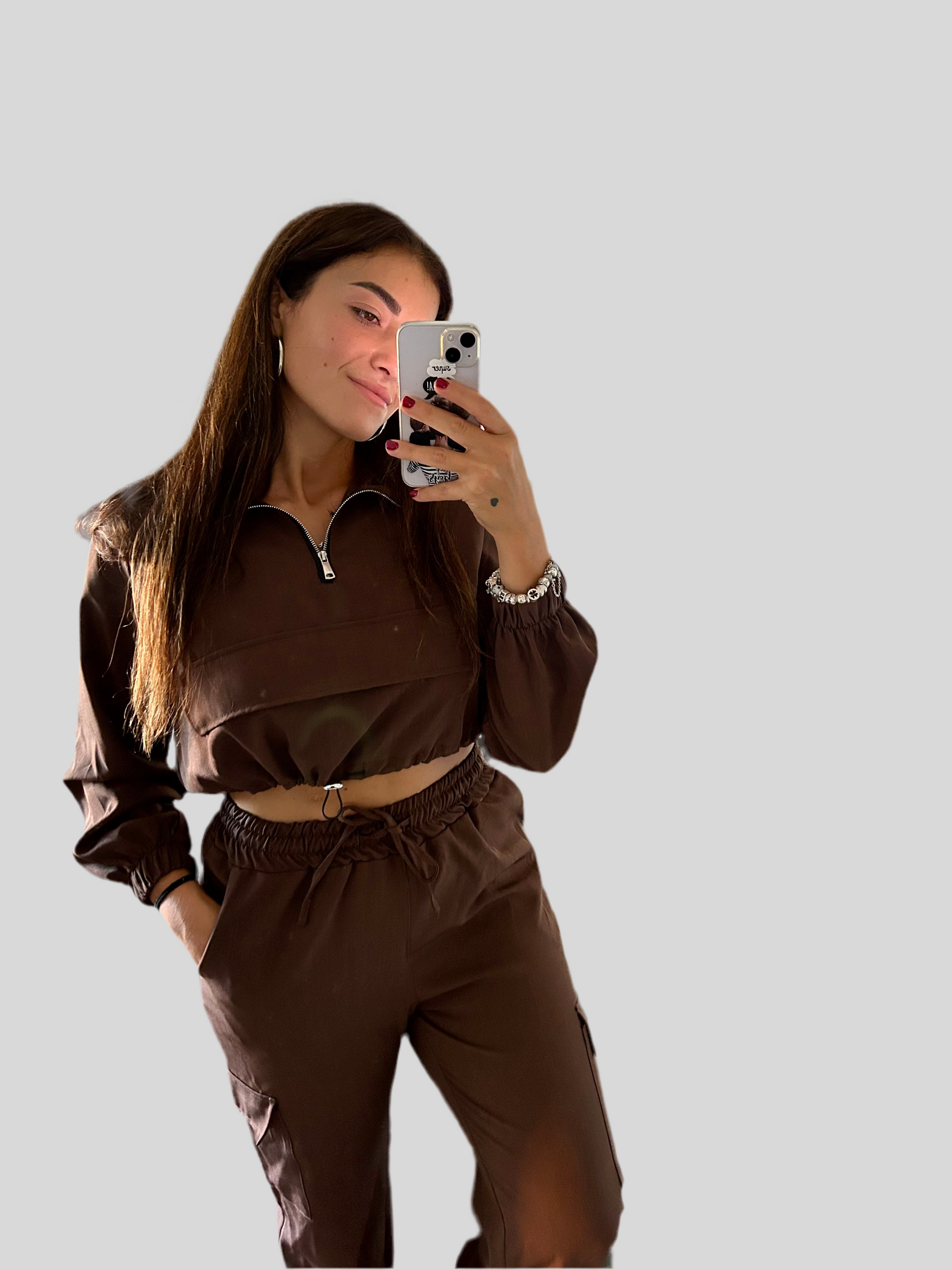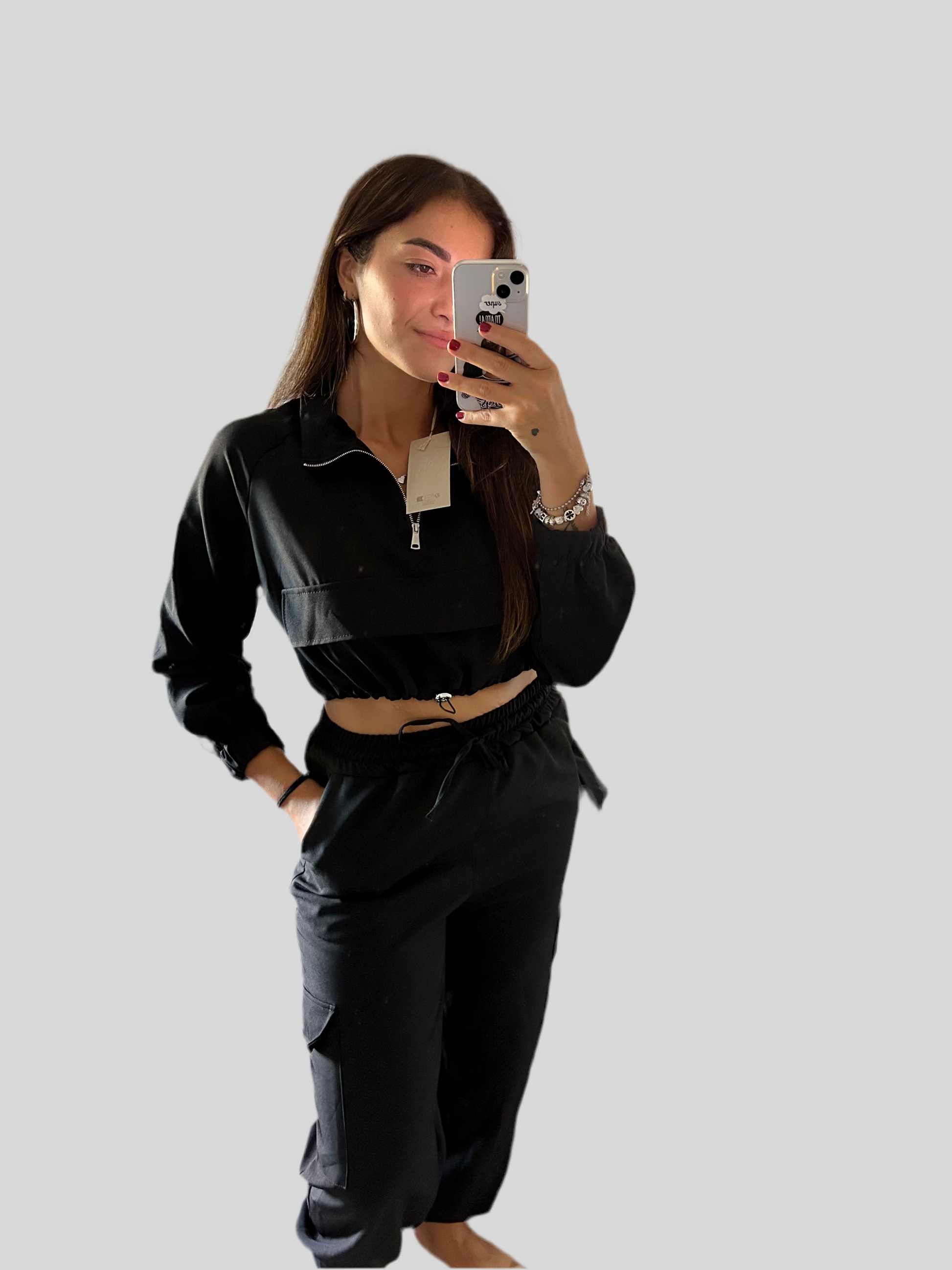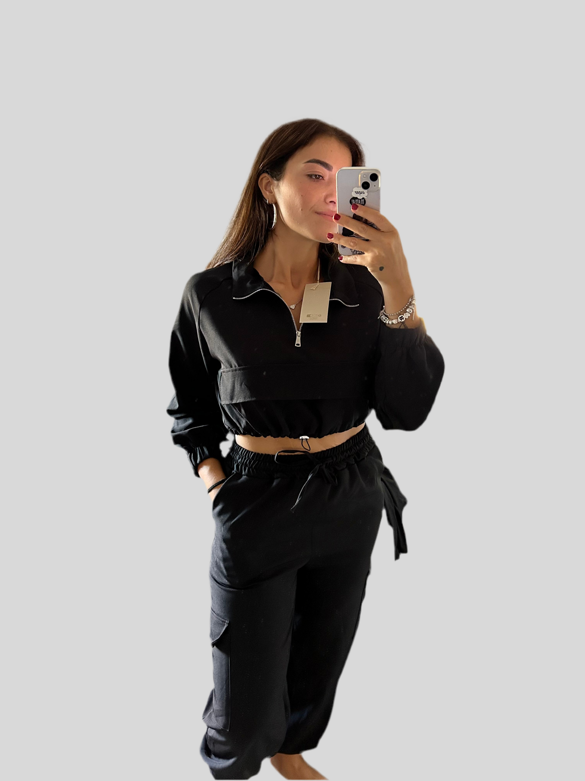 Completo con maglia crop e pantalone cargo , in tessuto tecnico e super elastico