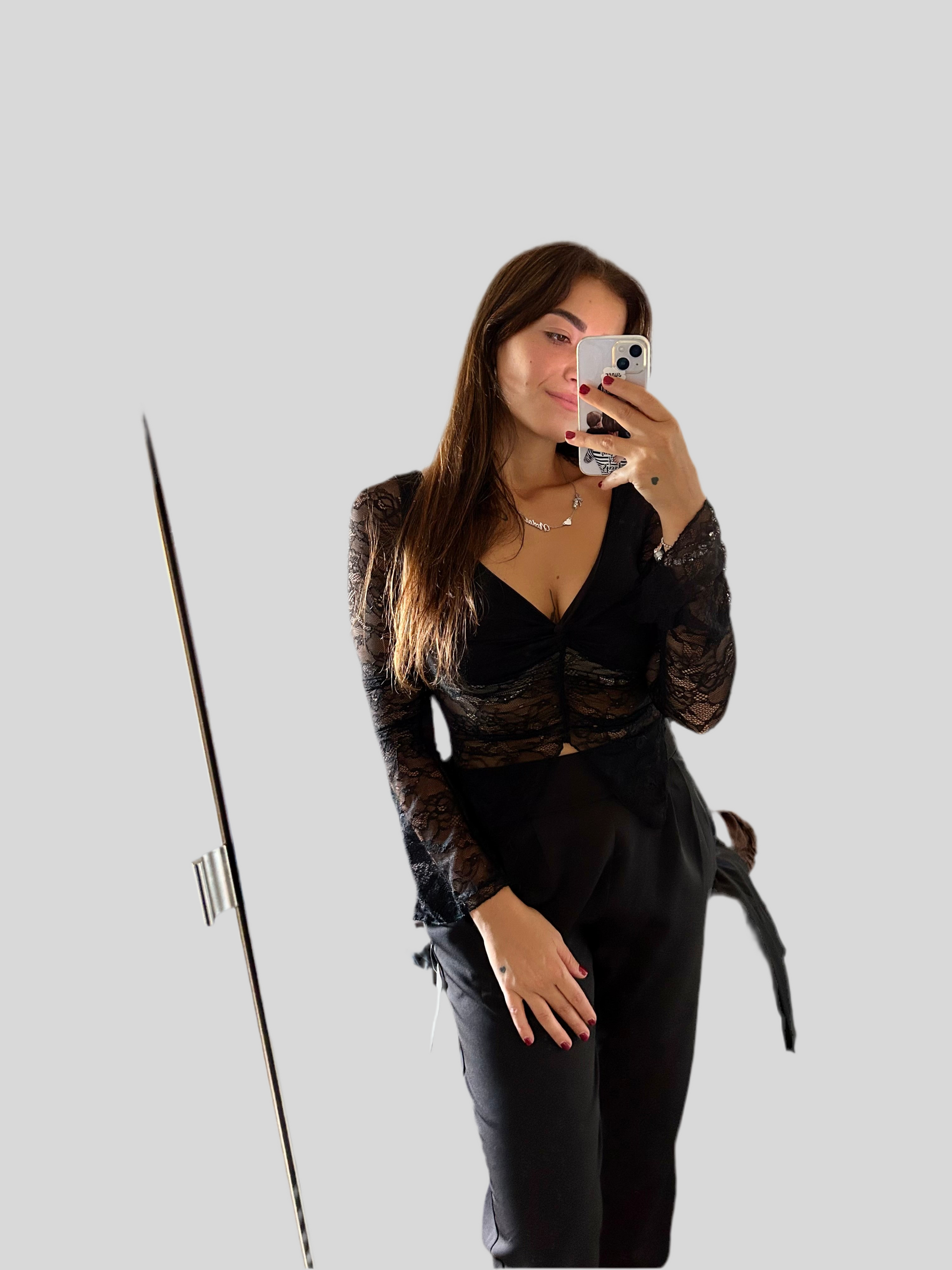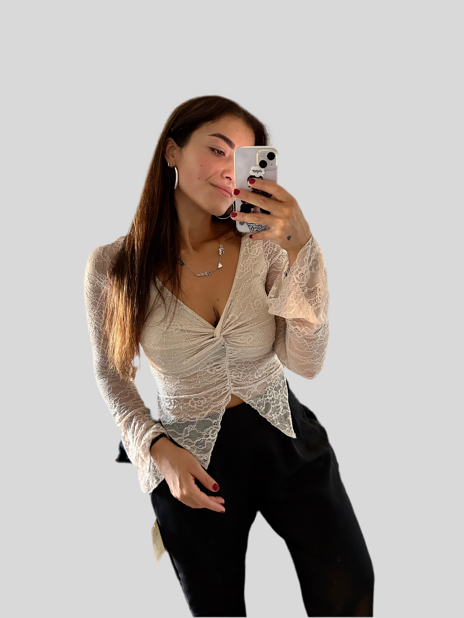 Maglia in pizzo con fodera sule seno e nodo frontale , super comoda e tessuto abbastanza elastico