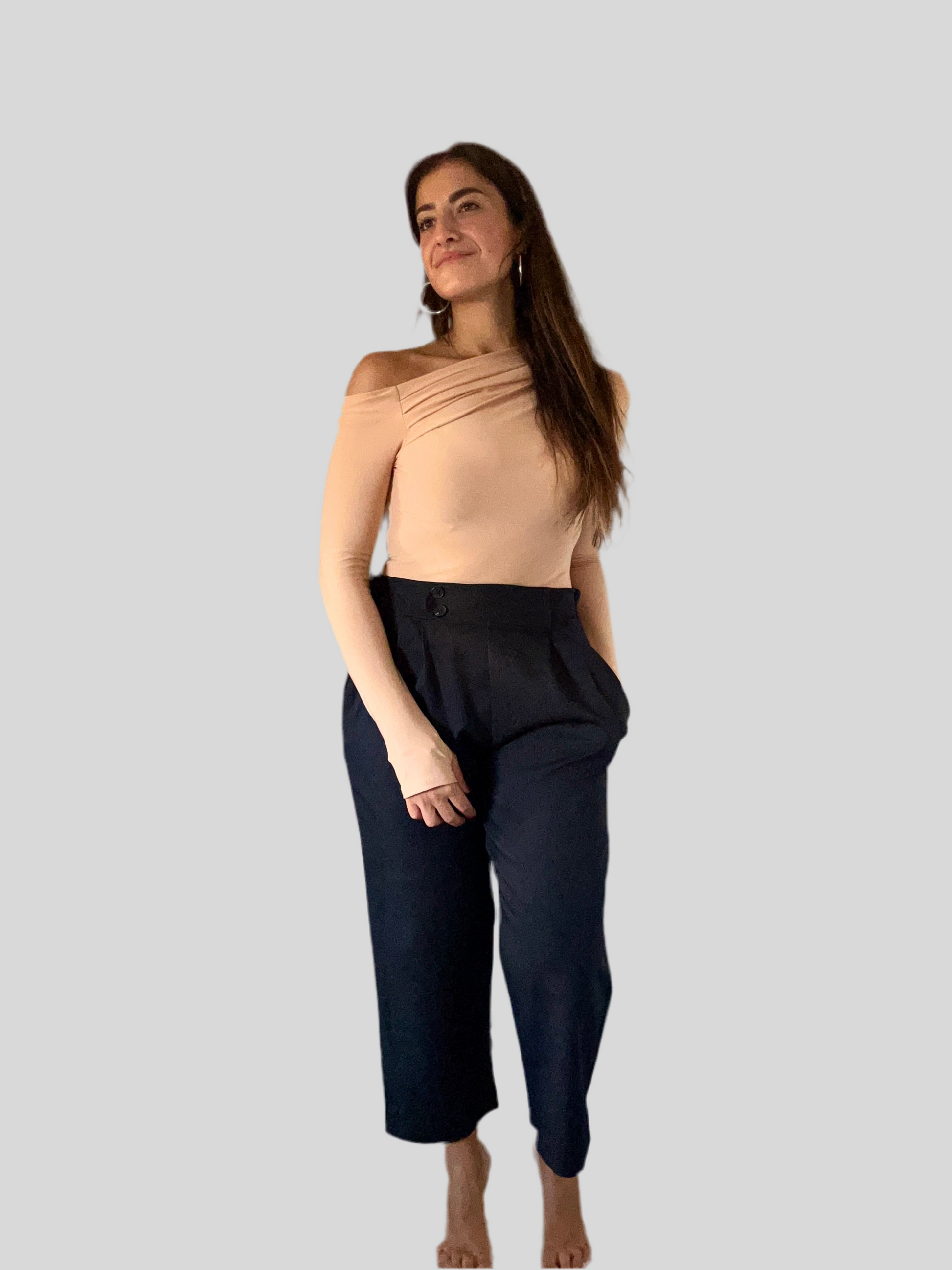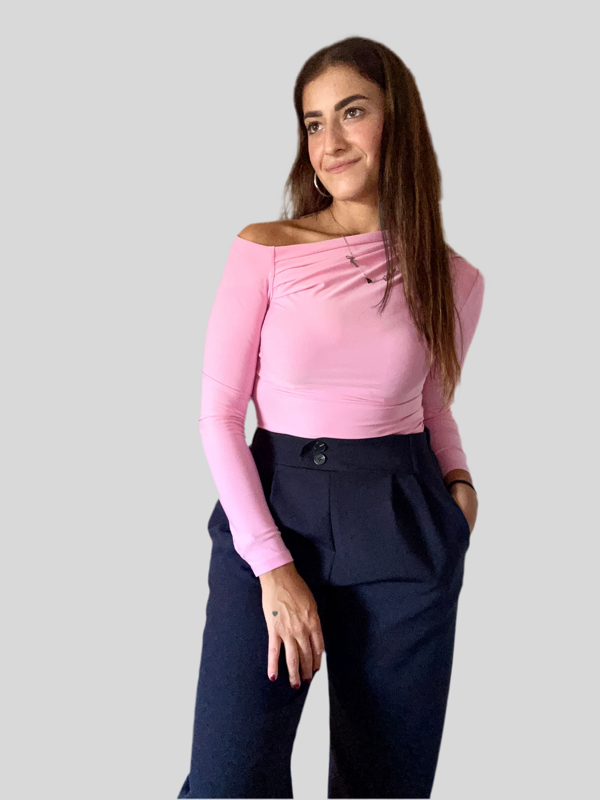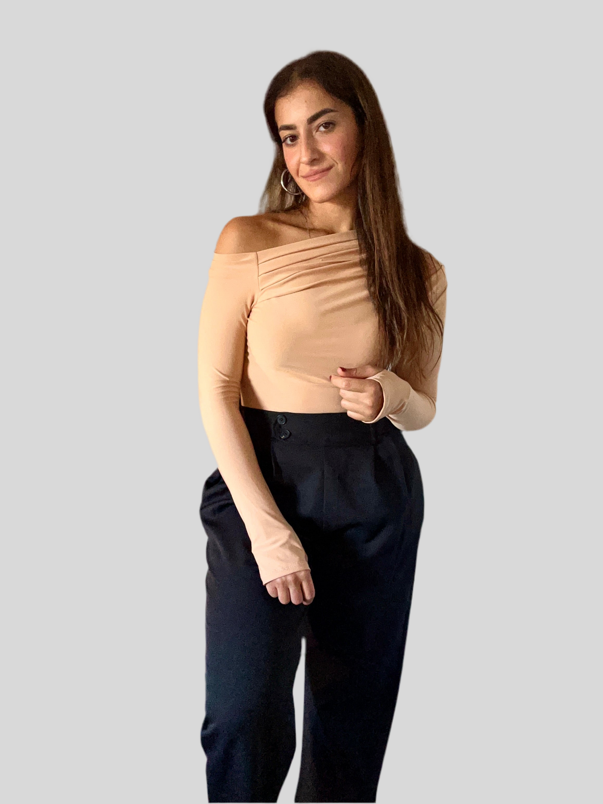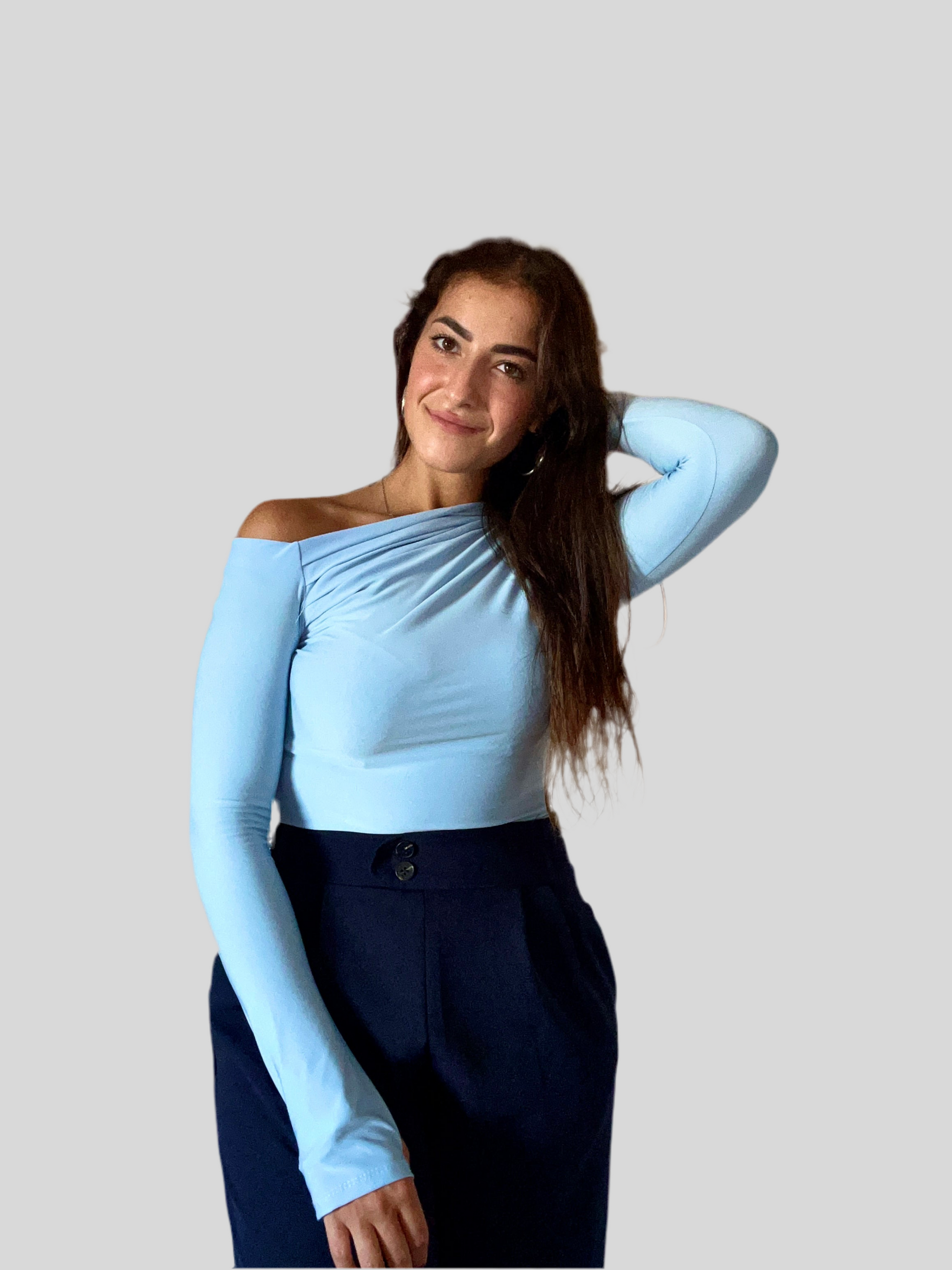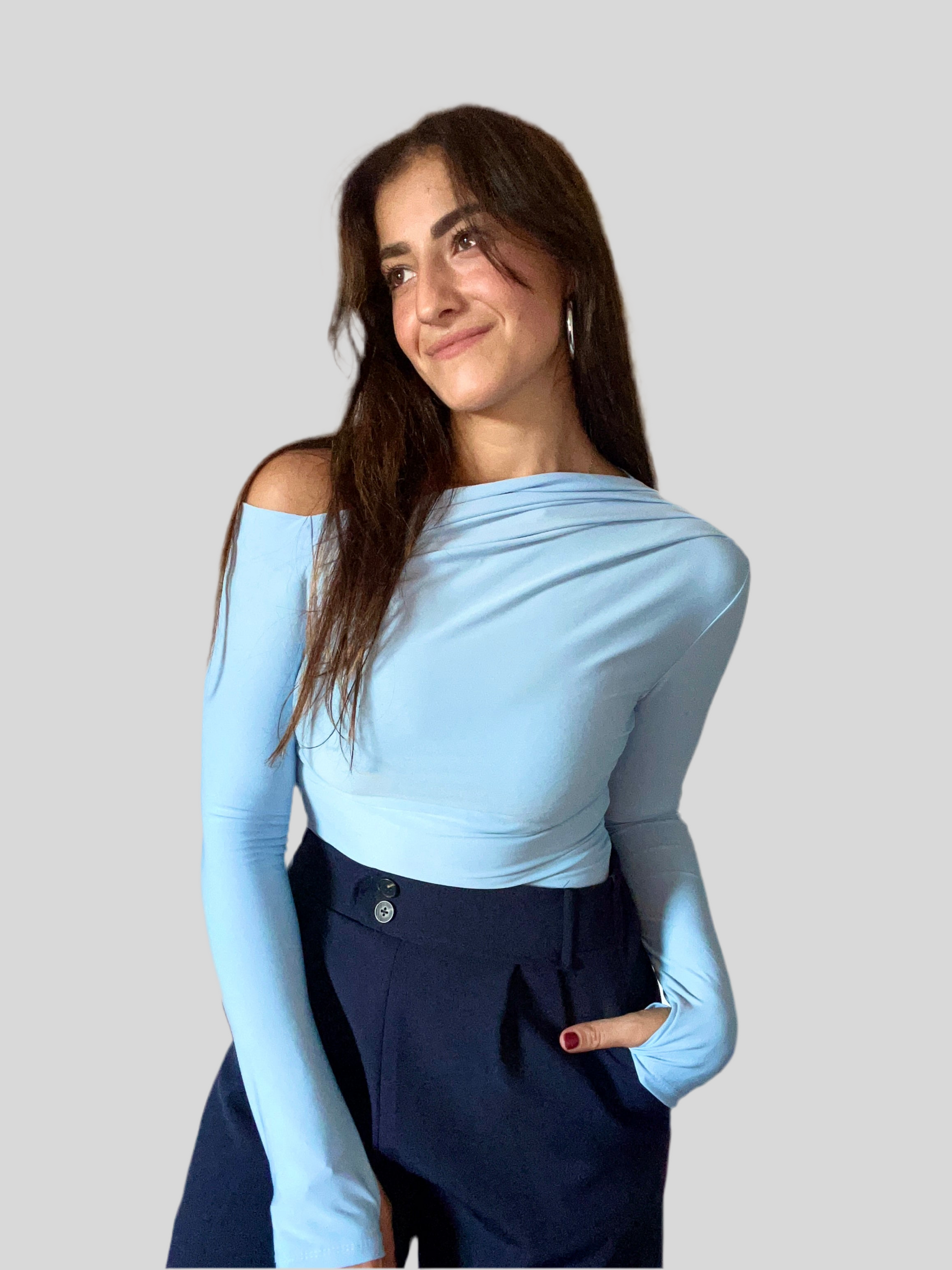 Maglia monospalla con scollo arricciato e manica lunga , tessuto elastico