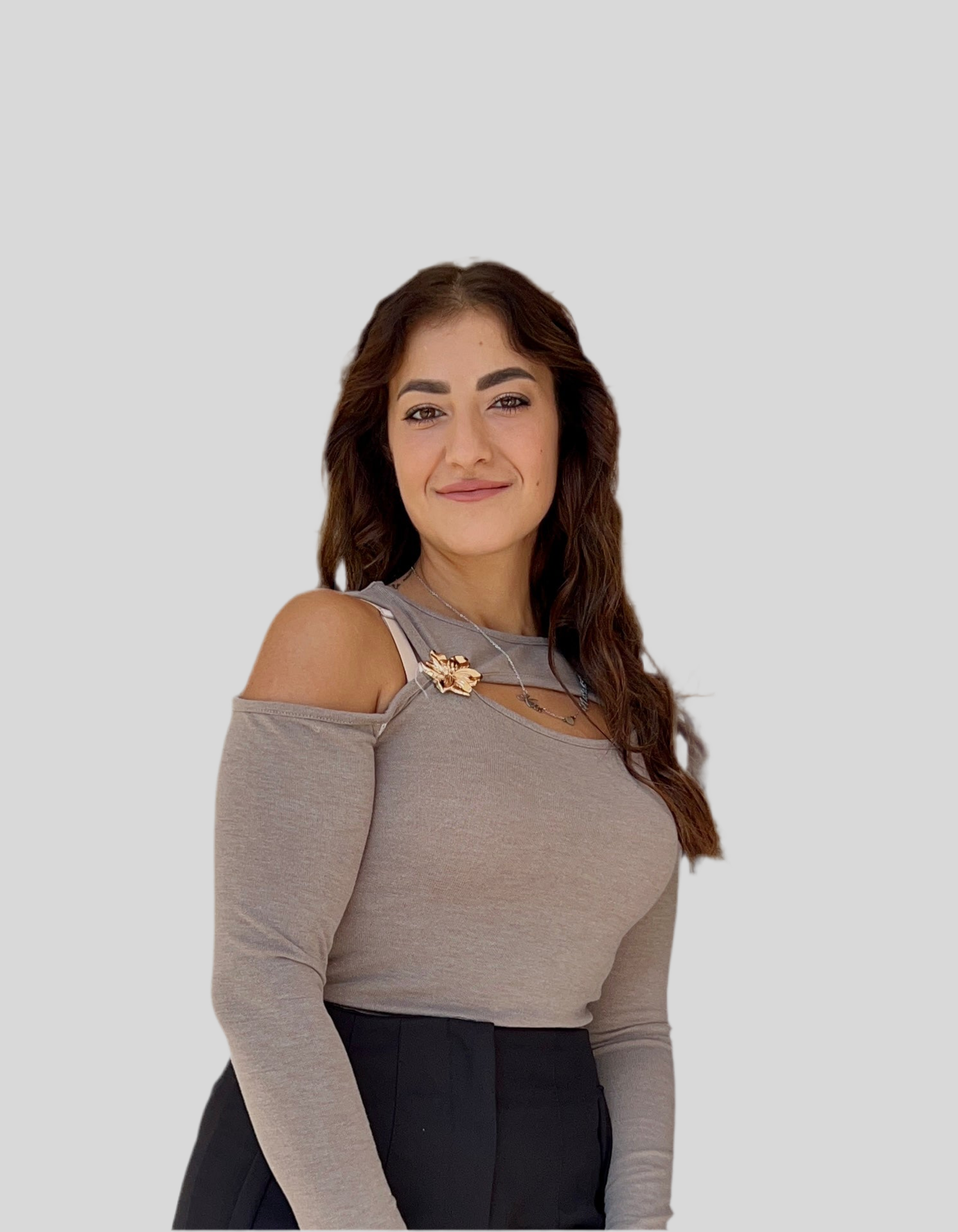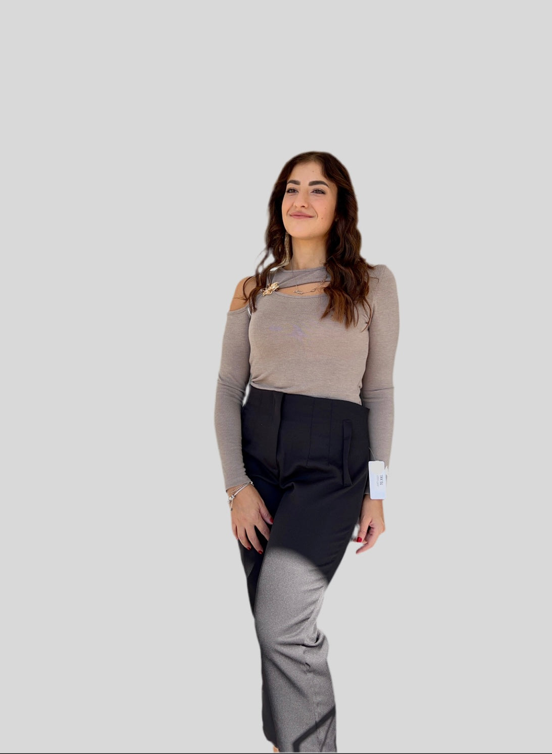 Top maniche lunghe spalla scoperta, doppio scollo con fiore oro
